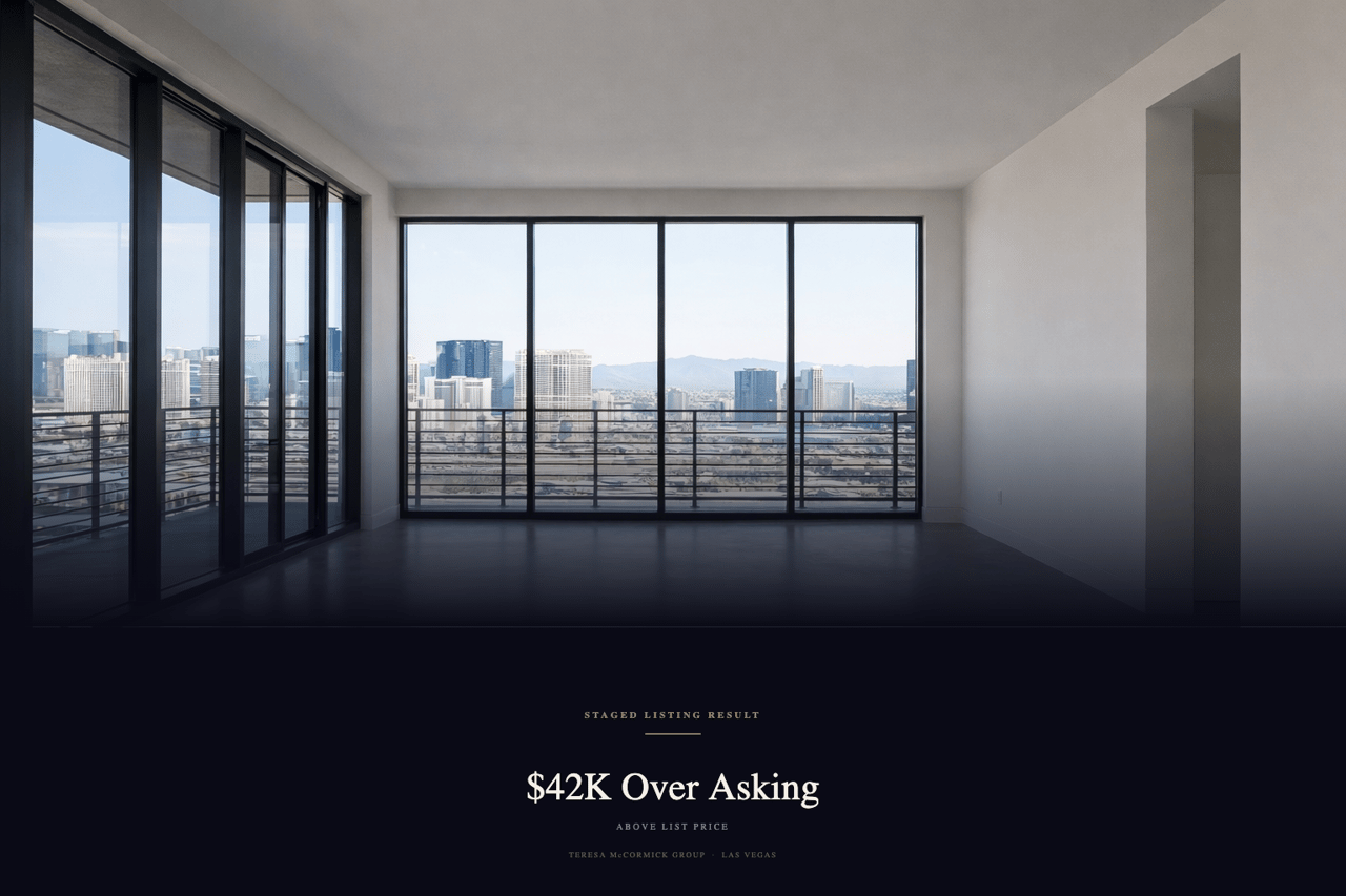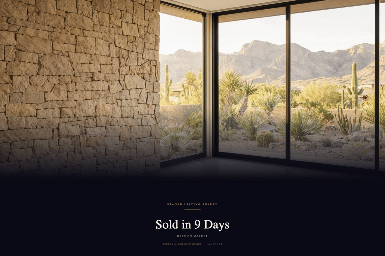 Teresa McCormick Group provides professional home staging at no upfront cost to sellers throughout Las Vegas, Summerlin, Henderson, and North Las Vegas. Our staged listings average just 14 days on market — and consistently sell at or above asking price.